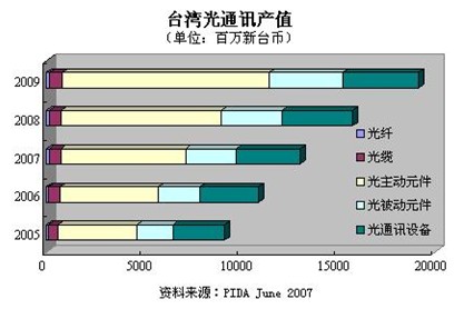 臺(tái)灣光通訊產(chǎn)業(yè)在近兩年也有明顯的增長(zhǎng),2006年臺(tái)灣光通訊產(chǎn)值相比2005年,增長(zhǎng)率達(dá)19%,預(yù)計(jì)今年臺(tái)灣光通訊產(chǎn)值較去年還將增長(zhǎng)20%。