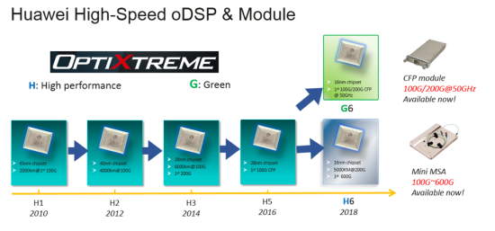 華為最新的oDSP技術(shù)(OptiXtreme)支持使用G6芯片的200G DWDM CFP模塊和配備H6芯片的600G DWDM模塊。下一代G7和H7 oDSP芯片(基于7nm技術(shù))將分別在2019年下半年和2020年上半年推出。G7將支持功耗更低的可插拔模塊,H7將用于每波長(zhǎng)800G的數(shù)據(jù)速率,如圖所示。