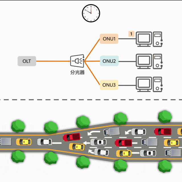 在PON網(wǎng)絡中,一個OLT(Optical Line Termination 光線路終端)的PON口下會連接多臺ONU(Optical Network Unit光網(wǎng)絡單元)設備,上行數(shù)據(jù)采用TDMA共享信道方式傳輸,由OLT統(tǒng)一給一個PON口下的所有ONU統(tǒng)一分配發(fā)光時隙,也就是說在每個時刻,只有一個ONU可以發(fā)光傳輸上行數(shù)據(jù),其他的ONU要排隊。這就好比本來是多個車道,到OLT那里需要合并成一個車道,體驗過高速堵車人都會知道是多么崩潰。