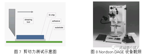 從外觀上,一般會在顯微鏡下觀察溢膠情況,比如要求至少有三邊溢膠。暴力的評價手段是用專用設備上的劈刀直接在芯片側(cè)面施加推力,測量將芯片推下來需要的最小用力,同時觀察載體上的芯片殘留情況,叫做剪切力測試,標準方面行業(yè)內(nèi)一般參考美軍標MIL-STD-883 Method 2019 (DIE SHEAR STRENGTH)。剪切力的測量設備我知道的就只有Nordson DAGE這款,似乎已經(jīng)形成壟斷了,下圖是剪切力測試的示意圖和Nordson DAGE設備的靚照。