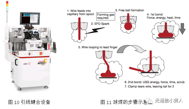 下面的圖片給出了光模塊生產(chǎn)工藝的幾個關鍵工序,其中貼片、打線、芯片老化這3個工序在半導體芯片后段制程中也有,網(wǎng)上能找到非常多的資料,后面4個則是由光學特性帶來的,資料相對來說少些。