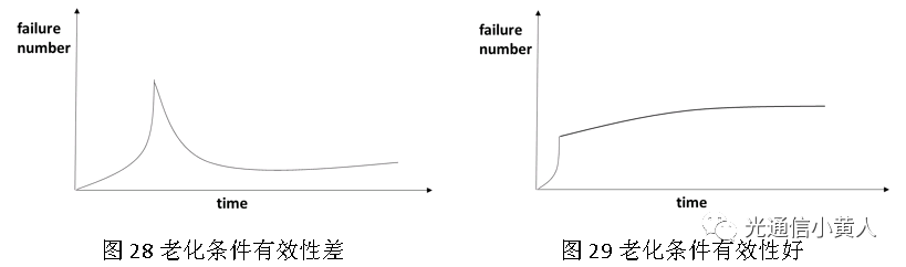 第一種是將篩選后的該批次產(chǎn)品發(fā)到市場端,然后監(jiān)控記錄市場失效數(shù)量和返回時間,如果失效數(shù)量在開始的一個時間段內(nèi)存在一個峰值,說明老化條件的有效性較差,導致部分早期失效產(chǎn)品未被充分篩選流入市場;如果失效數(shù)量經(jīng)過一段時間后穩(wěn)定,則說明老化條件有效性較好。具體參考下面的曲線,原理上應該不難理解。