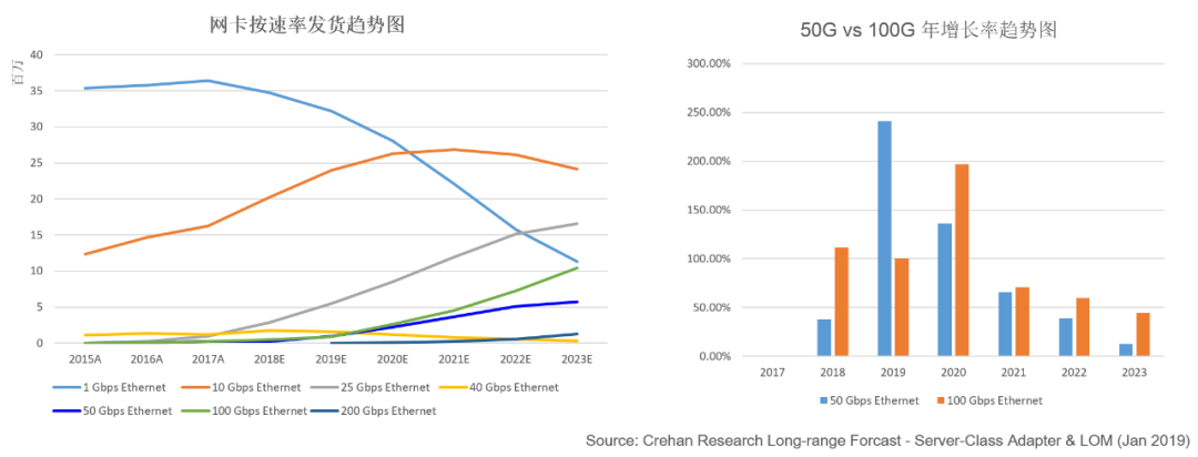 根據(jù)分析師機(jī)構(gòu)CREHAN的預(yù)測(cè),截止2019年,50G和100G網(wǎng)卡都已經(jīng)啟動(dòng)發(fā)貨。25G網(wǎng)卡的下一代升級(jí)選擇上,整個(gè)產(chǎn)業(yè)在2018和2019年存在著搖擺。2019年50G和100G服務(wù)器發(fā)貨量產(chǎn)生了逆轉(zhuǎn),但2020年后100G服務(wù)器的勢(shì)頭全面超越了50G服務(wù)器,產(chǎn)業(yè)又開(kāi)始對(duì)100G服務(wù)器充滿信心。