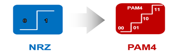 200GE和400GE光模塊與以往有點(diǎn)不同。傳統(tǒng)光模塊采用NRZ(Non-Return-to-Zero)的信號(hào)傳輸技術(shù),采用高、低兩種信號(hào)電平表示數(shù)字邏輯信號(hào)的0、1,每個(gè)時(shí)鐘周期可以傳輸1bit的邏輯信息。而200G和400G光模塊皆采用了高階調(diào)制技術(shù)——PAM4(Pulse Amplitude Modulation 4四階脈沖幅度調(diào)制)。PAM4信號(hào)采用4個(gè)不同的信號(hào)電平進(jìn)行信號(hào)傳輸,每個(gè)時(shí)鐘周期可以傳輸2bit的邏輯信息,即00、01、10、11。