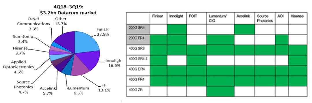 如上圖所示,200G的模塊種類只有100m SR4和2km FR4兩種,其中100m SR4只有兩家供應(yīng)商。反觀400G的模塊種類達(dá)到了5種,TOP8廠商皆對(duì)100m、500m和2km模塊進(jìn)行了布局。400G的產(chǎn)業(yè)成熟度遠(yuǎn)勝于200G,客戶的選擇也更為豐富。