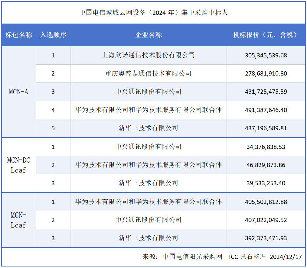 ICC訊 近日,中國(guó)電信于官網(wǎng)公示了中國(guó)電信城域云網(wǎng)設(shè)備(2024年)集中采購(gòu)項(xiàng)目的中選結(jié)果,華為、中興通訊及新華三等五大廠商入選。