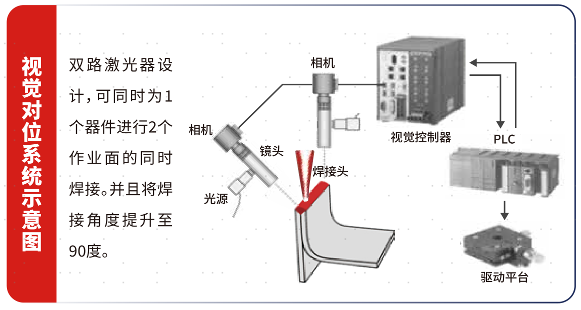 由高清數(shù)字式同軸CCD 視覺對位系統(tǒng)、圖像處理系統(tǒng)組成,可生成各點(diǎn)位的三維信息。通過焊縫與焊槍之間的偏差,結(jié)合焊槍與視覺之間的相對位置關(guān)系,將當(dāng)前偏差量發(fā)送給運(yùn)動執(zhí)行機(jī)構(gòu),對焊槍位置進(jìn)行運(yùn)動補(bǔ)償,從而實(shí)現(xiàn)焊接過程中對焊縫的跟蹤。有效解決了焊縫不良的問題。