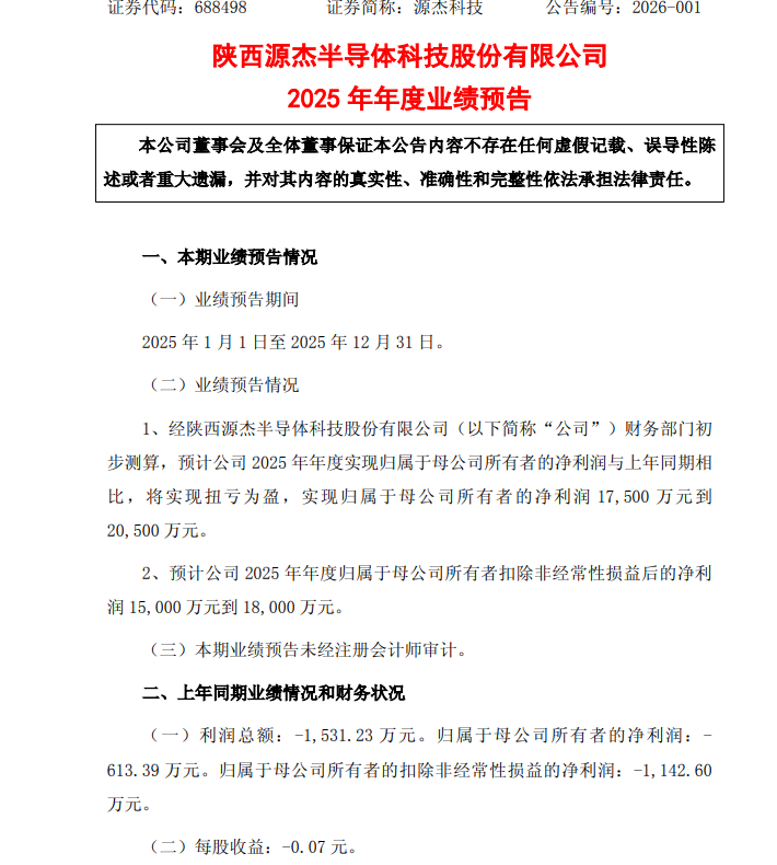 ICC訊 源杰科技1月30日發(fā)布2025年年度業(yè)績預(yù)告,預(yù)計2025年全年實現(xiàn)扭虧為盈。經(jīng)公司財務(wù)部門初步測算,2025年度歸屬于母公司所有者的凈利潤預(yù)計為1.75億元到2.05億元,上年同期為虧損613.39萬元;扣除非經(jīng)常性損益后的凈利潤預(yù)計為1.5億元到1.8億元,上年同期為虧損1142.60萬元。