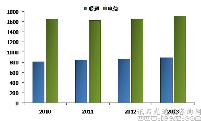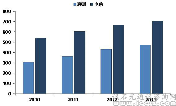 2010至2013年中電信和中聯(lián)通固網(wǎng)營收走勢圖(億元)