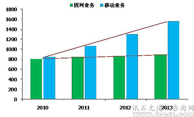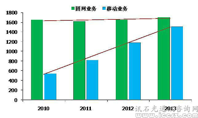 2010至2013年中國聯(lián)通移動業(yè)務與固網(wǎng)業(yè)務經(jīng)營情況走勢圖(億元)