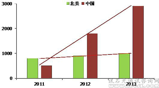中國和北美地區(qū)FTTH實際用戶數(shù)情況(萬戶)