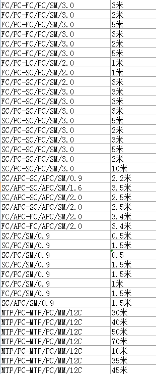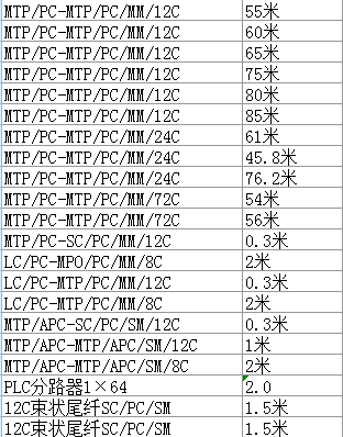 本次清倉的主要產(chǎn)品有:FC/PC-FC/PC/SM、SC/APC-SC/APC/SM、SC/PC/SM、MTP/PC-MTP/PC/MM、PLC分路器1×64、12C束狀尾纖SC/PC/SM等系列產(chǎn)品。價(jià)格從優(yōu),可開發(fā)票。詳細(xì)規(guī)格敬請(qǐng)查看以下表格。有需欲速致電許先生:13554921686。