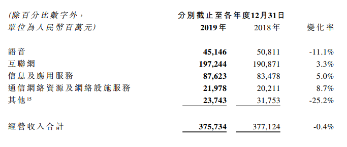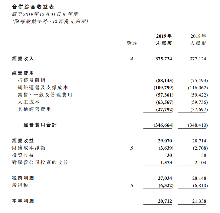 ICC訊(編輯:Debi)3月24日午間,中國電信公布截至2019年12月31日止之年度業(yè)績。2019年,公司經(jīng)營收入達(dá)到人民幣3,757億元,服務(wù)收入1達(dá)到人民幣3,576億元,同比增長 2.0%,繼續(xù)保持高于行業(yè)平均。其中,移動服務(wù)收入達(dá)到人民幣1,755元,同比增長4.7%;固網(wǎng)服務(wù)收入約為人民幣1,821億元,同比下降0.4%;新興業(yè)務(wù)收入占服務(wù)收入比達(dá)到 55.3%,拉動服務(wù)收入增長 4.5 個(gè)百分點(diǎn),收入結(jié)構(gòu)持續(xù)優(yōu)化,發(fā)展動能不斷壯大。EBITDA3達(dá)到人民幣1,172億元,同比增長12.5%。凈利潤達(dá)到人民幣205億元,同比下降3.3%,較剔除中國鐵塔股份有限公司上市一次性稅后收益的 2018 年凈利潤增長 2.0%,每股基本凈利潤為人民幣 0.25 元。資本開支約為人民幣776億元,其中除5G以外的投資連續(xù)4年下降,自由現(xiàn)金流為人民幣 217 億元。
