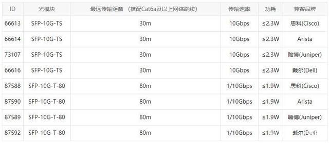 不同型號萬兆電口模塊的功能特點(diǎn)如下表所示: