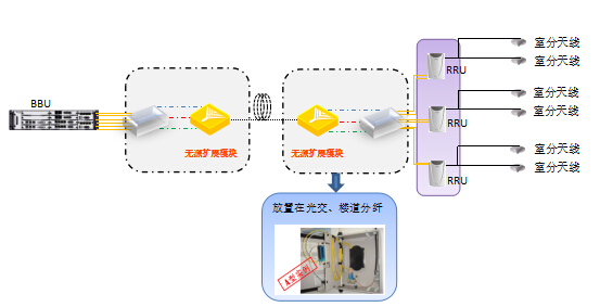采用無(wú)源擴(kuò)容器后,從BBU設(shè)備側(cè),通過(guò)無(wú)源擴(kuò)展器收斂3個(gè)扇區(qū)的CPRI信號(hào)后變成1芯光纜出局,傳輸?shù)絉RU側(cè),再通過(guò)同樣的無(wú)源擴(kuò)展器分離三個(gè)扇區(qū)的信號(hào)。最后通過(guò)跳纖和各RRU連接。