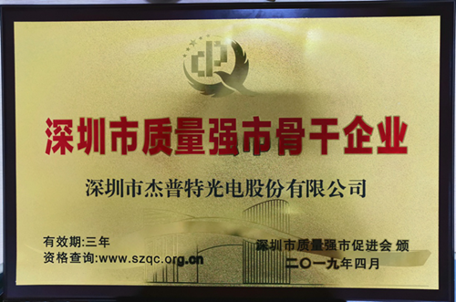 深圳市杰普特光電股份有限公司與董事長黃治家先生分獲“深圳市質(zhì)量強(qiáng)市骨干企業(yè)”和“質(zhì)量強(qiáng)市金質(zhì)獎(jiǎng)?wù)隆睒s譽(yù)稱號(hào)!