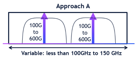 方法A:使用兩個(gè)高速的載波,每個(gè)載波都能夠?qū)崿F(xiàn)高達(dá)600G的帶寬,以及一個(gè)靈活的信道寬度,最高可達(dá)150GHz。