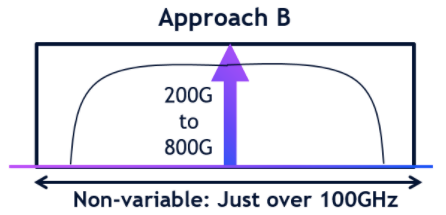 方法B:使用單個(gè)超強(qiáng)大載波,能夠?qū)崿F(xiàn)高達(dá)800G的帶寬,并且恒定的信道寬度剛好超過100GHz。