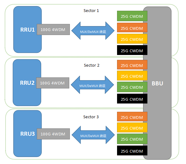 考慮到5G設備的平滑演進及產(chǎn)業(yè)鏈的發(fā)展狀況,光迅科技推出的100G QSFP28 4WDM & 25G SFP28 CWDM Fan-out 5G前傳解決方案,能夠在當前階段很好地解決5G毫米波前傳難題。在Fan-out方案中,天線側(cè)使用1100G光模塊,基帶側(cè)使用425G光模塊,不需要設備再增加額外的分流功能來進行兩端的速率匹配。天線側(cè)可以選用光迅科技推出的100G QSFP28 4WDM全工溫10KM模塊,基帶側(cè)也可以選用25G CWDM全工溫10KM模塊,通過一根MUX/DeMUX橋接連接,完成5G毫米波前傳承載網(wǎng)絡的構(gòu)建,同時也大大節(jié)省了光纖資源。