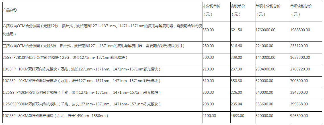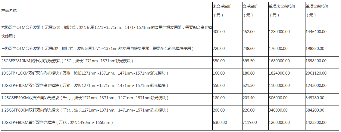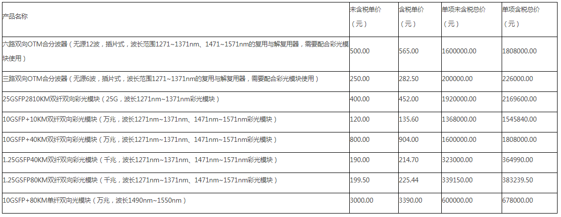 具體采購產(chǎn)品包括:六路雙向OTM合分波器 3200端、三路雙向OTM合分波器800端、25G SFP28 10KM雙纖雙向彩光模塊4800個(gè) 、10G SFP+10KM雙纖雙向彩光模塊11400個(gè)、10G SFP+40KM雙纖雙向彩光模塊 2000個(gè)、1.25G SFP 40KM雙纖雙向彩光模塊1700個(gè)、1.25G SFP 80KM雙纖雙向彩光模塊1700個(gè)、10G SFP+80KM單纖雙向光模塊 200個(gè)。