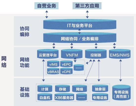 為實現(xiàn)上述目標(biāo),面向2025年的中國電信目標(biāo)網(wǎng)絡(luò)架構(gòu)從功能層劃分,將由“基礎(chǔ)設(shè)施層”、“網(wǎng)絡(luò)功能層”和“協(xié)同編排層”三個層面構(gòu)成。