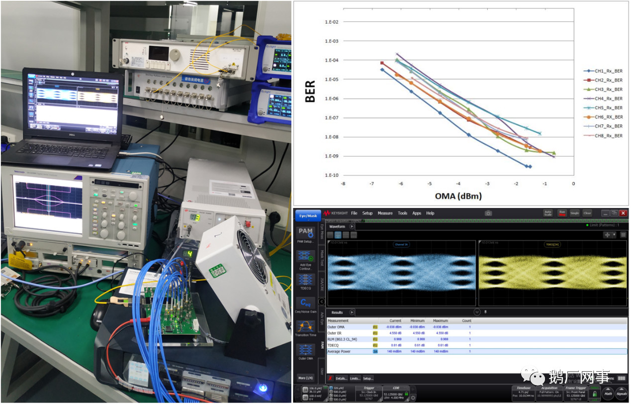 經(jīng)測(cè)試,各項(xiàng)指標(biāo)已經(jīng)超出預(yù)期,長(zhǎng)期測(cè)試接收誤碼率,不開FEC下BER<10-8,BER floor可以做到10-10, 發(fā)射端眼圖TDECQ指標(biāo)一般調(diào)節(jié)水平<0.6dB,均衡BER后可以做到<0.5dB,表現(xiàn)優(yōu)異,模塊整體功耗實(shí)測(cè)小于8.9w,甚至優(yōu)于大部分400G多模光模塊水平,這也是得益于集成化PIC和7nmDSP的功耗優(yōu)化。
