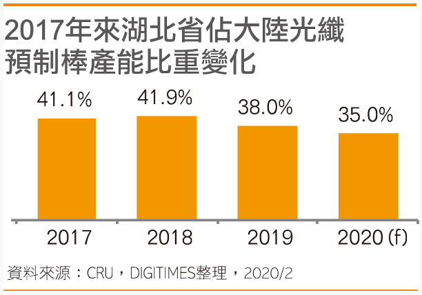 這主要在于過去幾年來(lái)隨著江蘇、山東、浙江等地區(qū)有更多多元化發(fā)展企業(yè)新建光電工廠,使得中國(guó)當(dāng)?shù)貙?duì)武漢和湖北省光纖光纜、光通訊組件的依賴逐漸降低。CRU數(shù)據(jù)顯示,湖北占中國(guó)光纖預(yù)制棒產(chǎn)能比重由2017年的41.1%攀升至2018年41.9%高點(diǎn)后,2019年比重已下滑至38%,而上述預(yù)期2020年更進(jìn)一步降至35%。