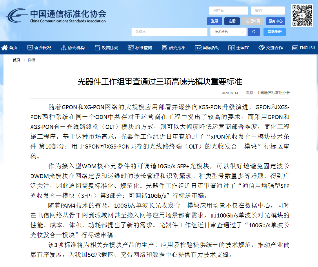 ICC訊 7月14日消息,中國通信標(biāo)準(zhǔn)化協(xié)會(huì)發(fā)布最新一期通信標(biāo)準(zhǔn)化簡訊,其中光器件工作組審查通過三項(xiàng)高速光模塊重要標(biāo)準(zhǔn)。