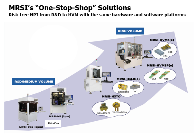 針對光通訊行業(yè)的大批量和高混合的生產(chǎn)特性,光通信企業(yè)需要靈活,高速且高精度的自動化技術(shù),以應(yīng)對數(shù)據(jù)中心市場和即將到來5G關(guān)鍵器件及時供應(yīng)和快速創(chuàng)新需求。MRSI Systems設(shè)備的靈活性也非常適用于其他各類光電器件研發(fā)和生產(chǎn)。近年推出的MRSI-HVM3產(chǎn)品系列以其領(lǐng)先的速度和<3微米貼片精度被公認(rèn)為業(yè)界領(lǐng)先的一流貼片機??梢詾榘ㄊ褂霉簿Ш?或蘸膠工藝的CoC封裝、CoS封裝和CoB封裝提供靈活和大批量貼片工藝的解決方案。通過其雙機頭、雙共晶焊接臺、“零時間”吸嘴轉(zhuǎn)換系統(tǒng)的配置,超快速共晶焊接溫度的升降,以及多層次多功能并行工藝自動化處理, 實現(xiàn)MRSI-HVM3產(chǎn)品系列卓越的性能。