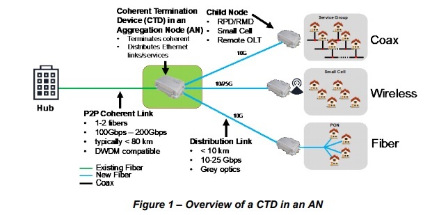 新規(guī)范是由CableLabs開發(fā)的點(diǎn)對(duì)點(diǎn)相干光學(xué)規(guī)范套件的一部分,定義了駐留在匯聚節(jié)點(diǎn) (AN) 中的CTD,該節(jié)點(diǎn)將多個(gè)光纖端點(diǎn)組合到單個(gè)光纖或光纖對(duì)上。CTD本身包括一個(gè)或多個(gè)相干收發(fā)器來終止相干光學(xué)鏈路。