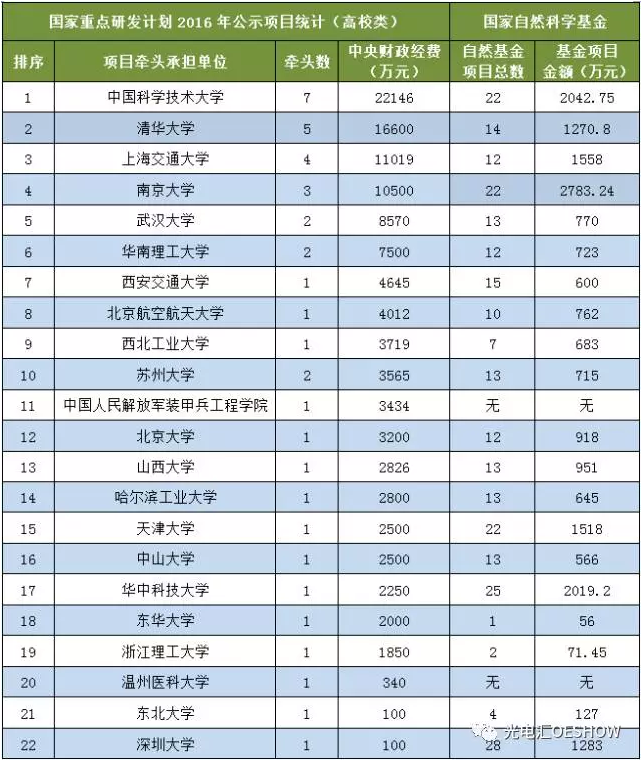 光電匯整理了各單位涉及光學領域的項目牽頭立項數(shù)和項目經(jīng)費情況,同時列出了各牽頭單位申請到的2016年度國家自然科學基金項目總數(shù)及總金額,供大家對比參考。(需要特別說明的是,一些項目需要實施1-2年后,評估后擇優(yōu),因此沒有給出經(jīng)費情況,不在本次統(tǒng)計范圍內(nèi)。)