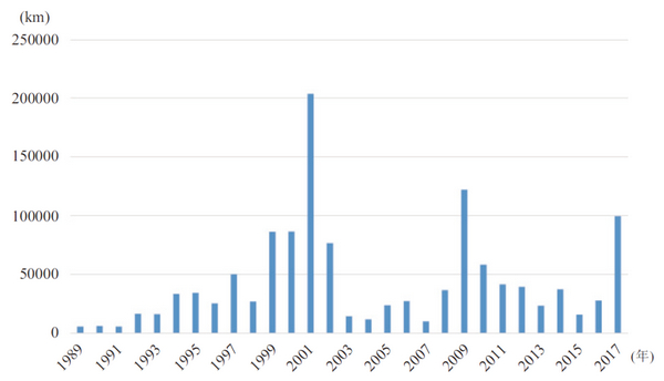 圖2 海底光纜部署距離(數(shù)據(jù)來源:Submarine Telecoms Forum)