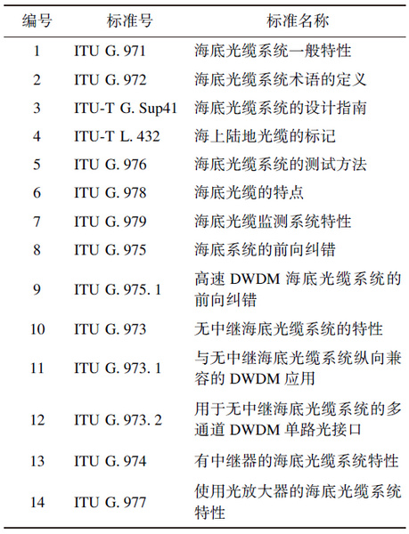 ITU-T SG15 Q8工作組共分為14個(gè)系列標(biāo)準(zhǔn),對海洋光通信網(wǎng)絡(luò)的海底及陸地光纜特性指標(biāo)和測試方法、不同類型系統(tǒng)特性和前向糾錯(cuò)等方面進(jìn)行了大量標(biāo)準(zhǔn)化工作(見表2)。