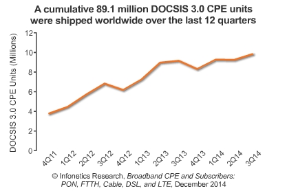 *三季度,累積出貨8910萬DOCSIS 3.0 CPE單位,這一數字超過過去12個季度的數量,即從Q411至Q314。