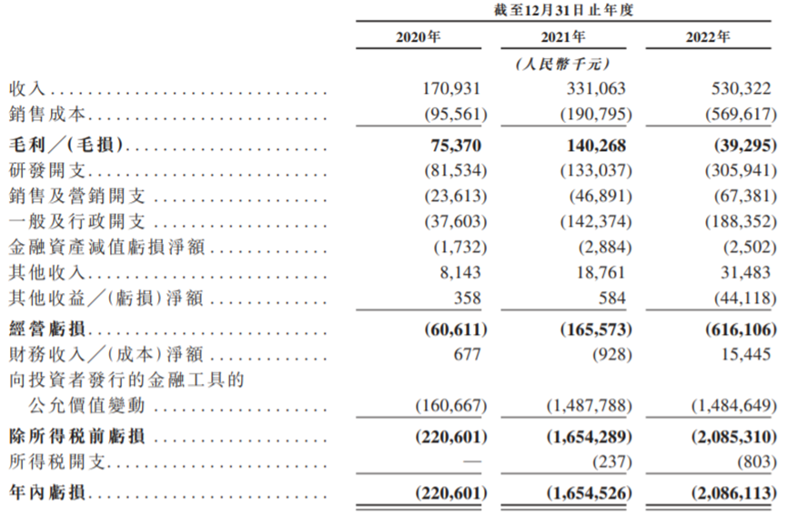 與此同時(shí),速騰聚創(chuàng)的營收也水漲船高。2020年至2022年,公司實(shí)現(xiàn)收入分別為1.71億元、3.31億元、5.30億元。但同時(shí)虧損情況也在加劇,速騰聚創(chuàng)這三年經(jīng)調(diào)整凈虧損分別約為0.60億元、1.08億元、5.63億元。