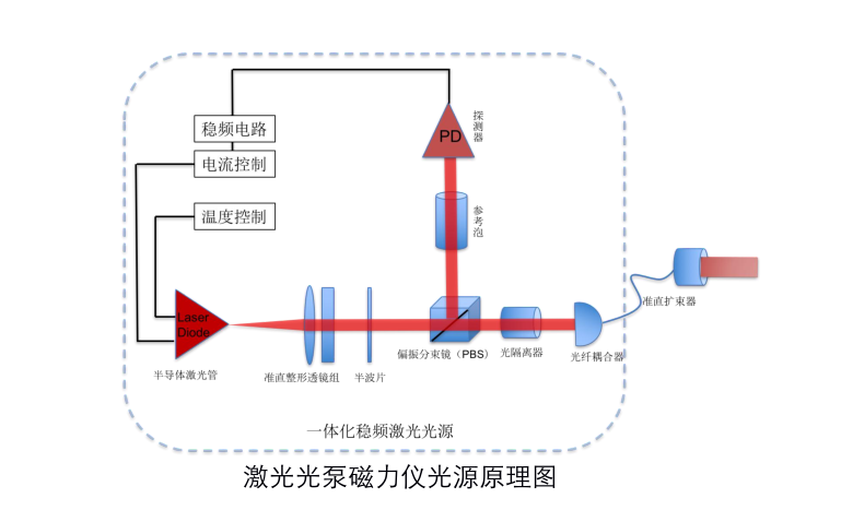 下圖為激光光泵磁力儀的光源原理圖。為了保證磁力儀的檢測靈敏度,激光光泵磁力儀的光源必須要具有很好的頻率穩(wěn)定度,功率穩(wěn)定度以及優(yōu)化設(shè)計的光束直徑。因此,激光光泵磁力儀光源應(yīng)包括準直整形,偏振分束,飽和吸收穩(wěn)頻光路以及相應(yīng)的高精度電流控制,溫度控制和穩(wěn)頻電路。另外,如果需要將穩(wěn)頻激光光束通過光纖傳輸?shù)酱帕x探頭以避免光源自身磁場對探測結(jié)果的干擾,還需要使用光纖耦合光路及后續(xù)的光纖準直擴束光路。