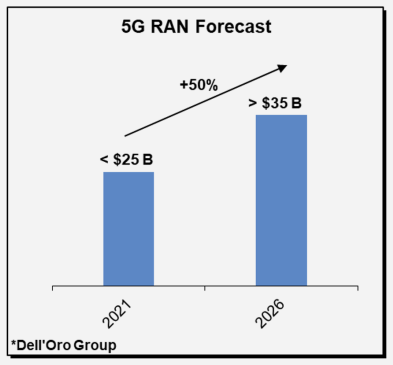 盡管5G RAN對(duì)于公共和私有NR IoT而言仍然意義重大,但市場(chǎng)仍處于初期階段。而且它們需要一些時(shí)間才能超越障礙并逐漸在RAN市場(chǎng)中占據(jù)較大份額(到2026年,私有LTE+5G Small Cell預(yù)計(jì)將達(dá)到8億至10億美元)。