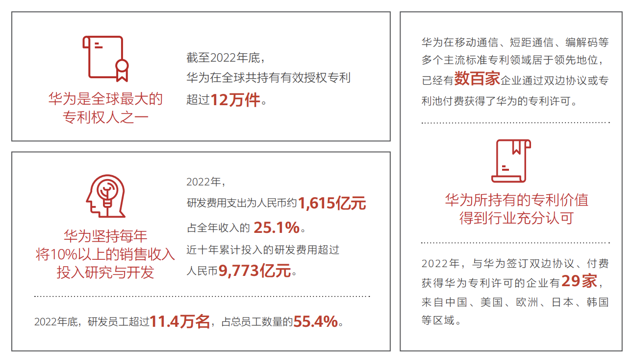 華為是全球最大的專利持有企業(yè)之一,截至2022年底,在全球共持有有效授權(quán)專利12萬件。2022年,華為憑借7689件PCT國際專利申請量持續(xù)排名榜首;與華為簽訂雙邊協(xié)議、付費獲得華為專利許可的企業(yè)有29家,來自中國、美國、歐洲、日本、韓國等區(qū)域。