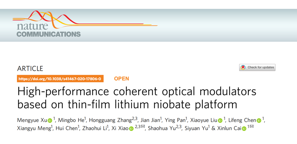 國家信息光電子創(chuàng)新中心此次入選“中國光學(xué)十大進(jìn)展”應(yīng)用研究類榜單的世界首例可用于相干光通信的高性能鈮酸鋰薄膜電光調(diào)制器芯片由肖希博士團(tuán)隊與中山大學(xué)蔡鑫倫教授團(tuán)隊合作。該成果實現(xiàn)了110GBaud QPSK及80GBaud 16-QAM的相干光調(diào)制,為世界最快速的光子芯片之一,研究成果被Nature子刊Nature Communications發(fā)表。該成果與此前聯(lián)合研制的超高速LiNbO3薄膜調(diào)制器成果(收錄為ECOC 2019 PDP,是ECOC會議四十五年來中國大陸光芯片領(lǐng)域的第一篇一作 PDP論文)均為光通信領(lǐng)域的最新技術(shù)進(jìn)展和紀(jì)錄性成果,代表著我國在下一代光芯片前沿研究方面已經(jīng)步入國際前列。
