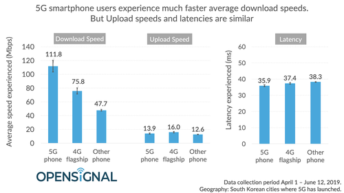 Opensignal發(fā)現(xiàn),在韓國三星S10 5G和LG電子V50 ThinQ 5G等5G下載的平均下載速度為118 Mbit / s,比同類近期4G智能手機(jī)快48%,比其他4G手機(jī)快143%。