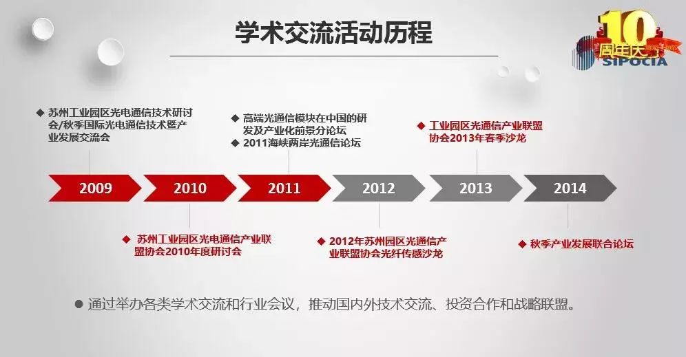 金秋十月,涼風(fēng)送爽。10月18日,蘇州光電通信產(chǎn)業(yè)聯(lián)盟協(xié)會(“SIPOCIA”)2019年度高峰論壇暨改選大會于10月18日下午在蘇州盛大舉辦,今年又恰逢協(xié)會成立十周年,大會有來自會員中際旭創(chuàng)、蘇州天孚、東捷光電、Ⅱ-Ⅵ、海光芯創(chuàng)、蘇納光電、海拓儀器及蘇州工業(yè)園區(qū)科技發(fā)展有限公司等30多家企事業(yè)單位近百名嘉賓代表齊聚一堂,就光電通信行業(yè)最新技術(shù)和市場話題進(jìn)行探討和交流,共同慶祝協(xié)會成立十周年