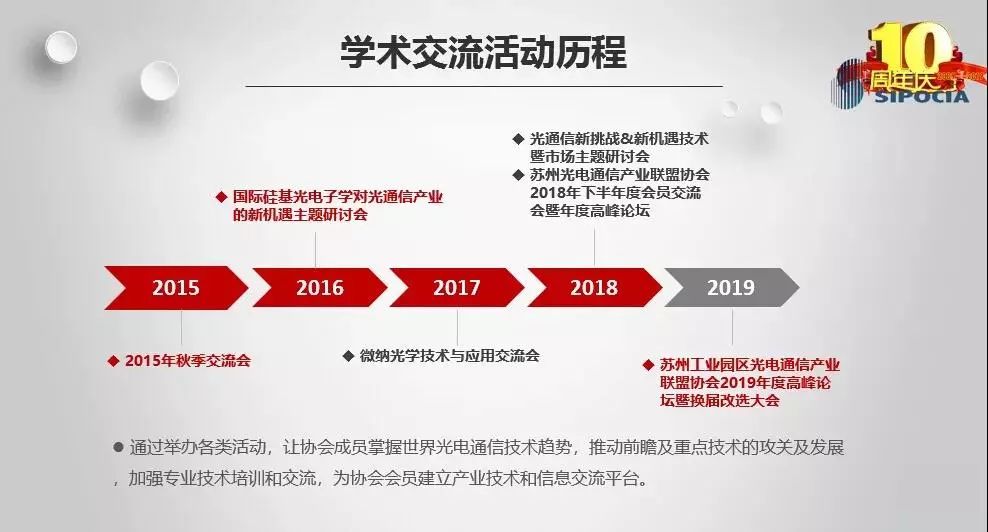 金秋十月,涼風(fēng)送爽。10月18日,蘇州光電通信產(chǎn)業(yè)聯(lián)盟協(xié)會(“SIPOCIA”)2019年度高峰論壇暨改選大會于10月18日下午在蘇州盛大舉辦,今年又恰逢協(xié)會成立十周年,大會有來自會員中際旭創(chuàng)、蘇州天孚、東捷光電、Ⅱ-Ⅵ、海光芯創(chuàng)、蘇納光電、海拓儀器及蘇州工業(yè)園區(qū)科技發(fā)展有限公司等30多家企事業(yè)單位近百名嘉賓代表齊聚一堂,就光電通信行業(yè)最新技術(shù)和市場話題進(jìn)行探討和交流,共同慶祝協(xié)會成立十周年。