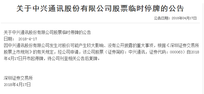 受該消息影響,盡管中興通訊官方已出公告回應(yīng):“中興通訊已獲悉美國(guó)商務(wù)部對(duì)公司激活拒絕令。公司正在全面評(píng)估此事件對(duì)公司可能產(chǎn)生的影響,與各方面積極溝通及應(yīng)對(duì)?!钡?月17日,中興通訊股票大受影響,出現(xiàn)跌停情況,現(xiàn)官方已發(fā)布臨時(shí)停牌公告。