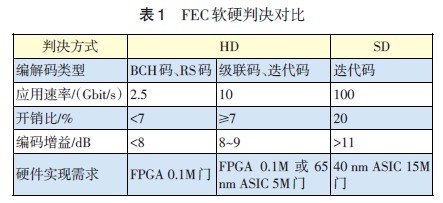 FEC技術(shù)以編碼冗余度(7%~20%)以及相應(yīng)的芯片處理復(fù)雜度來換取更大的凈增益,同時(shí)也是改善100G系統(tǒng)OSNR要求的關(guān)鍵技術(shù)之一。光互聯(lián)論壇(OIF)建議軟判決FEC開銷比小于20%,糾錯(cuò)極限可以達(dá)到1E-2量級。根據(jù)研究結(jié)果,低于20%開銷比時(shí)凈增益隨著冗余度增加而增大,而超過后受錯(cuò)誤平層(Error Floor)影響增益反而下降[1]。另外,信號(hào)速率提高導(dǎo)致數(shù)模轉(zhuǎn)換(ADC)和DSP處理能力要求也急劇增加(見表1)。7%開銷的硬判決(HD)方式(有些廠商也采用FEC開銷比大于7%的HD方式),ADC的采樣率一般需要56 GSa/s左右,軟判(SD)的開銷比達(dá)到20%時(shí),線路速率達(dá)到128 Gbit/s,ADC采樣速率一般需要64 Gsa/s左右,功耗基本要比硬判決高出20%左右,同時(shí)也要采用40 nm 甚至28 nm 工藝的專用集成電路(ASIC)技術(shù)才能實(shí)現(xiàn)高運(yùn)算量和低功耗目標(biāo)[2]。從目前設(shè)備廠商的設(shè)備具體實(shí)現(xiàn)來看,大部分廠商傾向于軟硬結(jié)合的判決方式,以平衡算法復(fù)雜度、功耗等關(guān)鍵參數(shù)。