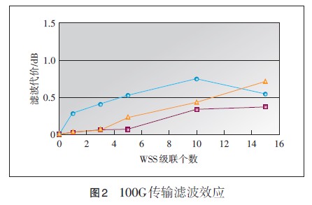 100G系統(tǒng)多跨段長距離傳輸一般都需要采用基于波長選擇開關(guān)(WSS)的可重構(gòu)分插復(fù)用器(ROADM)進(jìn)行功率均衡,同時(shí)考慮到未來100G系統(tǒng)城域網(wǎng)應(yīng)用,100G系統(tǒng)也需要支持多個(gè)ROADM級聯(lián)傳輸,因此研究100G系統(tǒng)信號(hào)的多級濾波效應(yīng)非常重要。