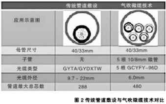 隨著FTTH規(guī)?;l(fā)展,各地均出現(xiàn)管道資源匱乏的情況,節(jié)約管道資源、突破管道瓶頸是當前建設者迫切需要解決的問題。氣吹微纜技術是當前最佳解決方案之一。以一根40/33的子管為例,如圖2所示,采用氣吹微纜技術,管道的最大總芯數(shù)可以達到480芯,極大地提高了管道利用率。此外,技術施工速度快,布放靈活,不僅節(jié)約了建設成本,還在短時間內緩解了管道資源緊張的狀況,為以后的管道擴容提供了彈性空間。