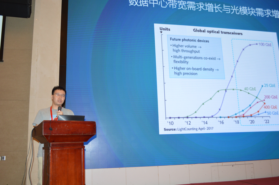 Facebook供應商質量工程師Vincent在會上發(fā)表主題為《PIC manufacturing Challenges and New Reliability Considerations》的演講,介紹了Facebook數(shù)據(jù)中心規(guī)模以及大數(shù)據(jù)中心內部的光互連。其表示大數(shù)據(jù)中心需要光模塊,并從100G與400G的需求走勢、晶圓集成和封裝工藝等方面闡述PIC制造挑戰(zhàn)和新的可靠性考慮因素。
