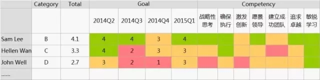 多談一點(diǎn),當(dāng)我們?nèi)ズ饬恳粋€(gè)人的綜合表現(xiàn)——績(jī)效(業(yè)績(jī)+勝任力),如果簡(jiǎn)單地把業(yè)績(jī)和勝任力表現(xiàn)加權(quán)平均,就掩蓋了兩者各自的高低差異,造成趨中失真,在“尋找”人才的盤(pán)點(diǎn)業(yè)務(wù)中,九宮格(nine-block box)和彩色編碼系統(tǒng)(color-coded system)更合理。