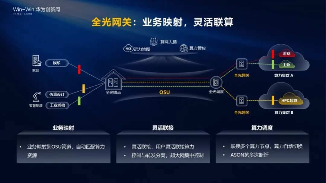 在F5.5G時代,確定性的運力包含超大帶寬、超低時延及超高可靠三大特征,與算力深度融合才能應(yīng)對海量用戶的上云和算力需求。靳玉志指出,華為全光品質(zhì)運力網(wǎng)絡(luò),向下聯(lián)接企業(yè)和家庭,向上聯(lián)接云和算力,支撐運營商的網(wǎng)絡(luò)建設(shè)和業(yè)務(wù)發(fā)展,其中包含全光錨點、全光終端、全光調(diào)度、全光網(wǎng)關(guān)、運力地圖五大創(chuàng)新方案。