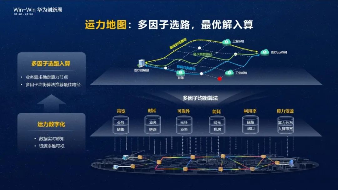 運力地圖實際上是將帶寬、時延、可靠性、能耗、利用率等運力資源全面數(shù)字化,幫助運營商實現(xiàn)對網(wǎng)絡(luò)進行全面規(guī)劃、運維和管理,同時,支持以不同維度的可視化方式展現(xiàn)。運力地圖采用多因子均衡算法,根據(jù)用戶配置偏好和業(yè)務(wù)SLA要求(比如最低時延、最大利用率、最高可靠性等),為用戶匹配最合適的算力節(jié)點,并在用戶和算力之間推薦最優(yōu)的運力路徑。